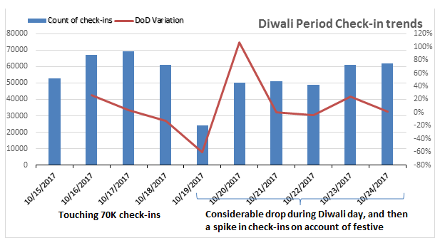 The chart shows the vehicle check-in trends for the period of pre and post-Diwali. Pre Diwali preparations led to an increase in the number of check-ins, with people venturing out to the streets and shopping. Post-Diwali day, a 107% increase in the number of check-ins has been witnessed on account of auspicious occasions following Diwali.